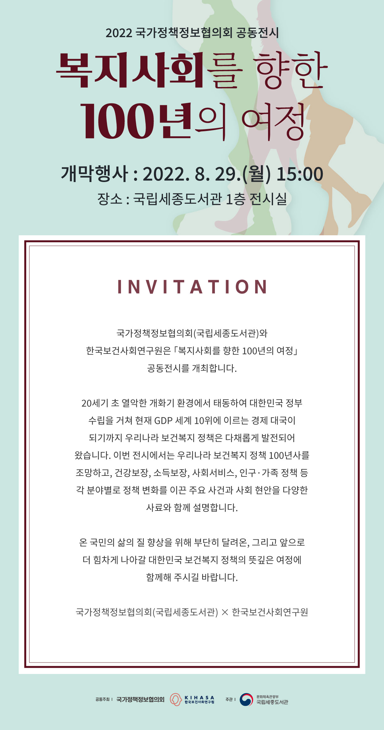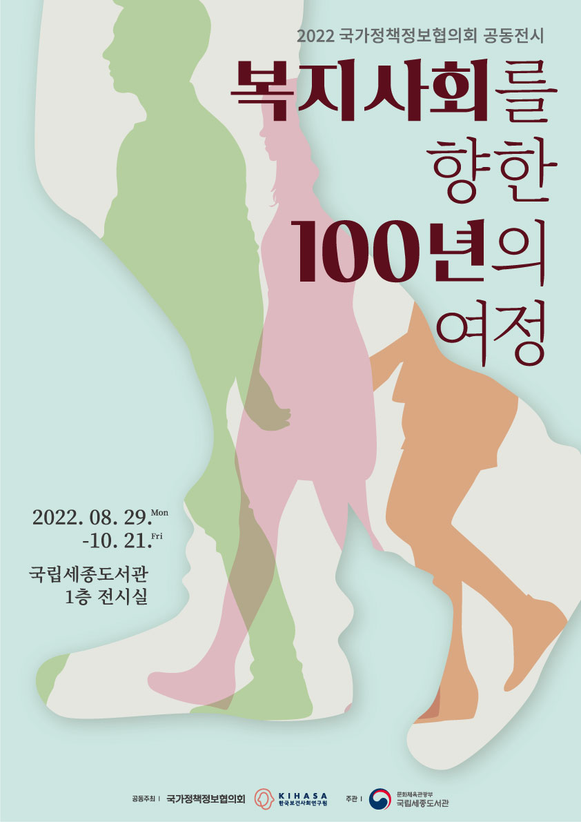 □ 한국보건사회연구원(원장 이태수, 이하 보사연)은 8월 29일(월)부터 10월 21일(금)까지 국립세종도서관 1층 전시실에서 「복지사회를 향한 100년의 여정」을 주제로 전시회를 개최한다.